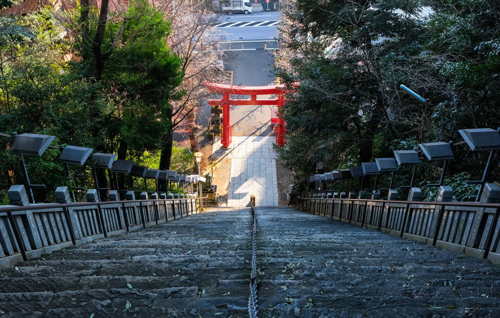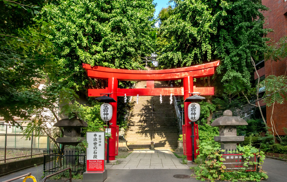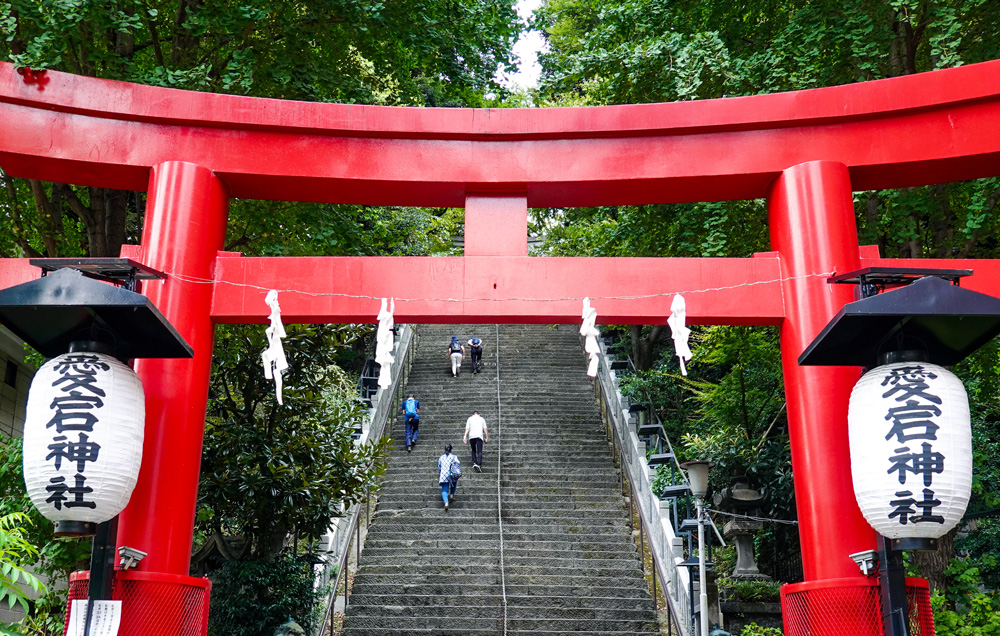 愛宕神社(あたごじんじゃ)は、東京都港区愛宕一丁目、愛宕山(標高25.7m)の山頂に鎮座する神社です。主祭神は火産霊命で、防火・戦勝に結びつく愛宕信仰の神として知られ、京都の愛宕神社を総本社とします。創建は慶長8年(1603年)で、徳川家康の命により滋賀県甲賀市信楽町の新宮神社の境外摂社・愛宕神社を勧請したとされます。配祀として罔象女命、大山祇命、日本武尊、勝軍地蔵菩薩、普賢大菩薩などを祀ります。正面参道の急な男坂は、寛永11年(1634年)に曲垣平九郎が馬で駆け上がり将軍家光に梅を献上した逸話から「出世の石段」と呼ばれ、現在は86段。例大祭は9月22日〜24日で、「出世の石段祭」とも称されます。