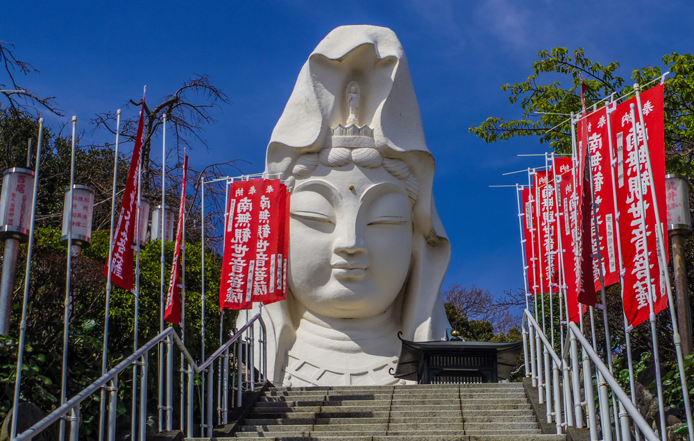大船観音寺(おおふなかんのんじ)は、神奈川県鎌倉市岡本にある曹洞宗の寺で、JR大船駅西口から徒歩約10分。全長約25mの巨大な白衣観音像「大船観音」で知られ、大船の街のシンボルとしてライトアップも行われます。観音像は1929年に護国観音として築造が始まり、1934年に輪郭ができたものの不況などで中断し、戦後に財団法人・大船観音協会が引き継いで1960年に完成しました。立像案もありましたが地山崩壊の懸念から胸像に変更。内部には展示室があり、戦没者や原爆犠牲者を弔う碑なども境内に並びます。
