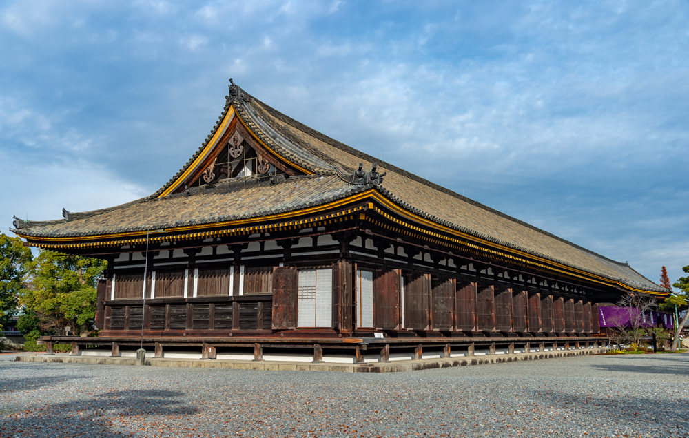 三十三間堂(さんじゅうさんげんどう)は、京都市東山区にある天台宗の寺院で、正式名称は「蓮華王院本堂」。本尊は千手観音で、妙法院の飛地境内として同院が所有・管理しています。創建は平安時代末の1164年(長寛2)に後白河上皇が発願し、平清盛の寄進で建立されたのが始まり。堂名は、内陣の柱間が33あることに由来します。現在の本堂は鎌倉時代に再建されたもので、南北約120mの細長い木造建築として知られます。堂内には中尊の千手観音坐像を中心に、千体の千手観音立像や二十八部衆像などが安置され、観音信仰の霊場(洛陽三十三所観音霊場第17番札所)としても親しまれています。
